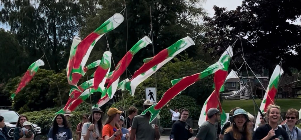 Created 30 silk salmon wind socks for protests and parades. Handmade with the help of voluneers
